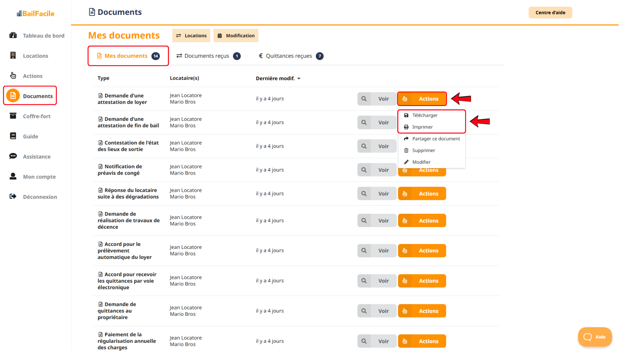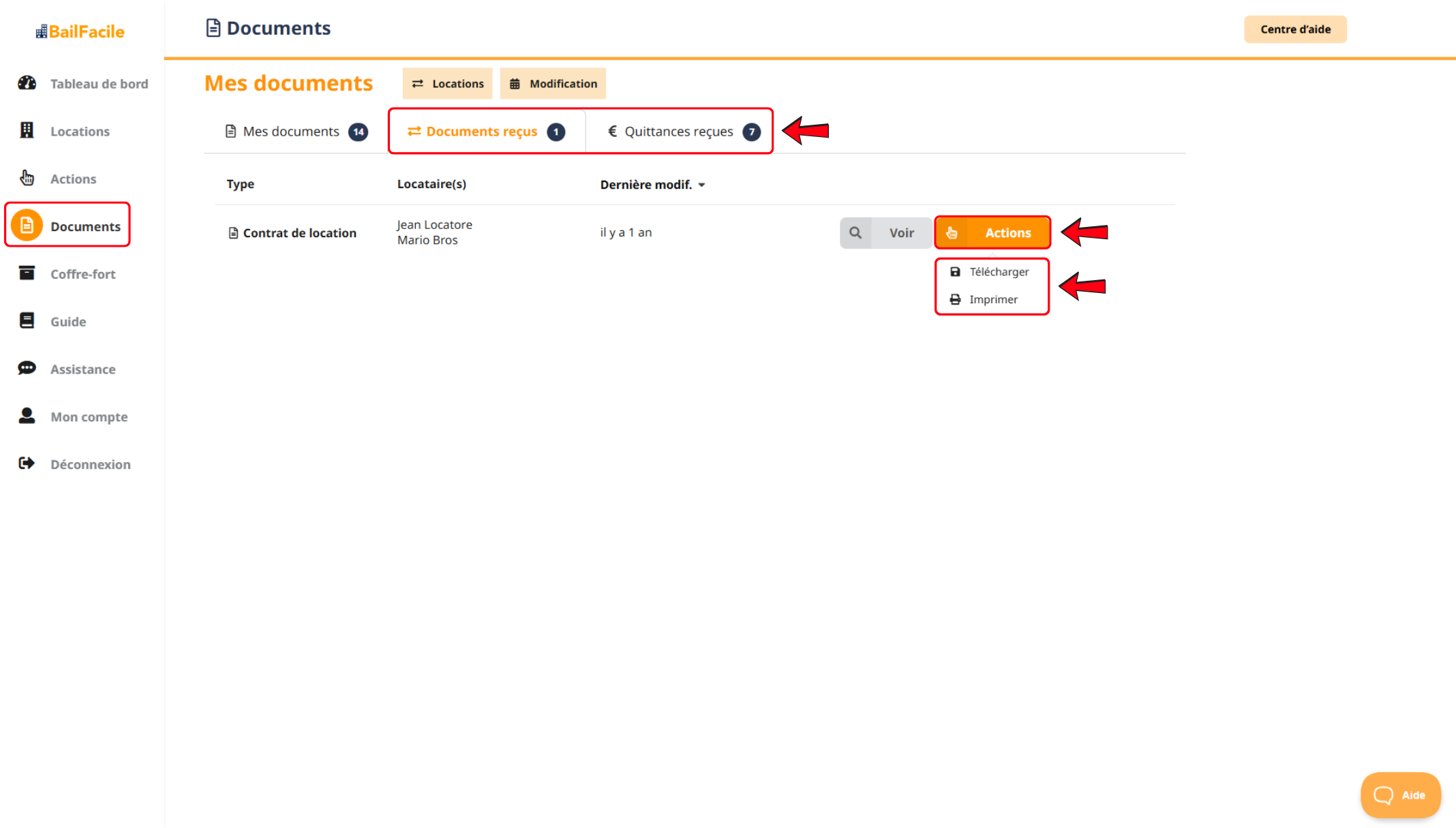L'action se fait toujours via le bouton "Actions", mais les documents sont accessibles dans l'onglet “Documents” ou "Quittances".