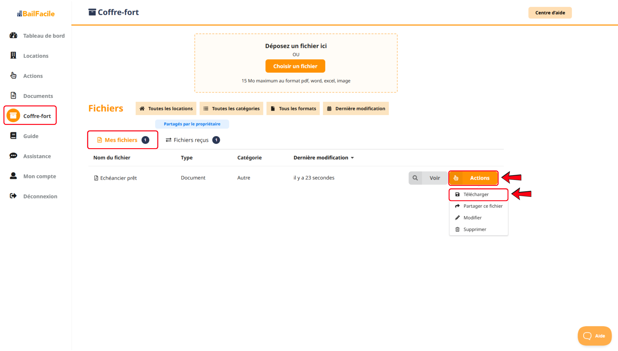 ➡️ Rendez-vous à l'onglet "Mes fichiers" de la page "Coffre-fort", cliquez sur "Actions" puis sur "Télécharger"