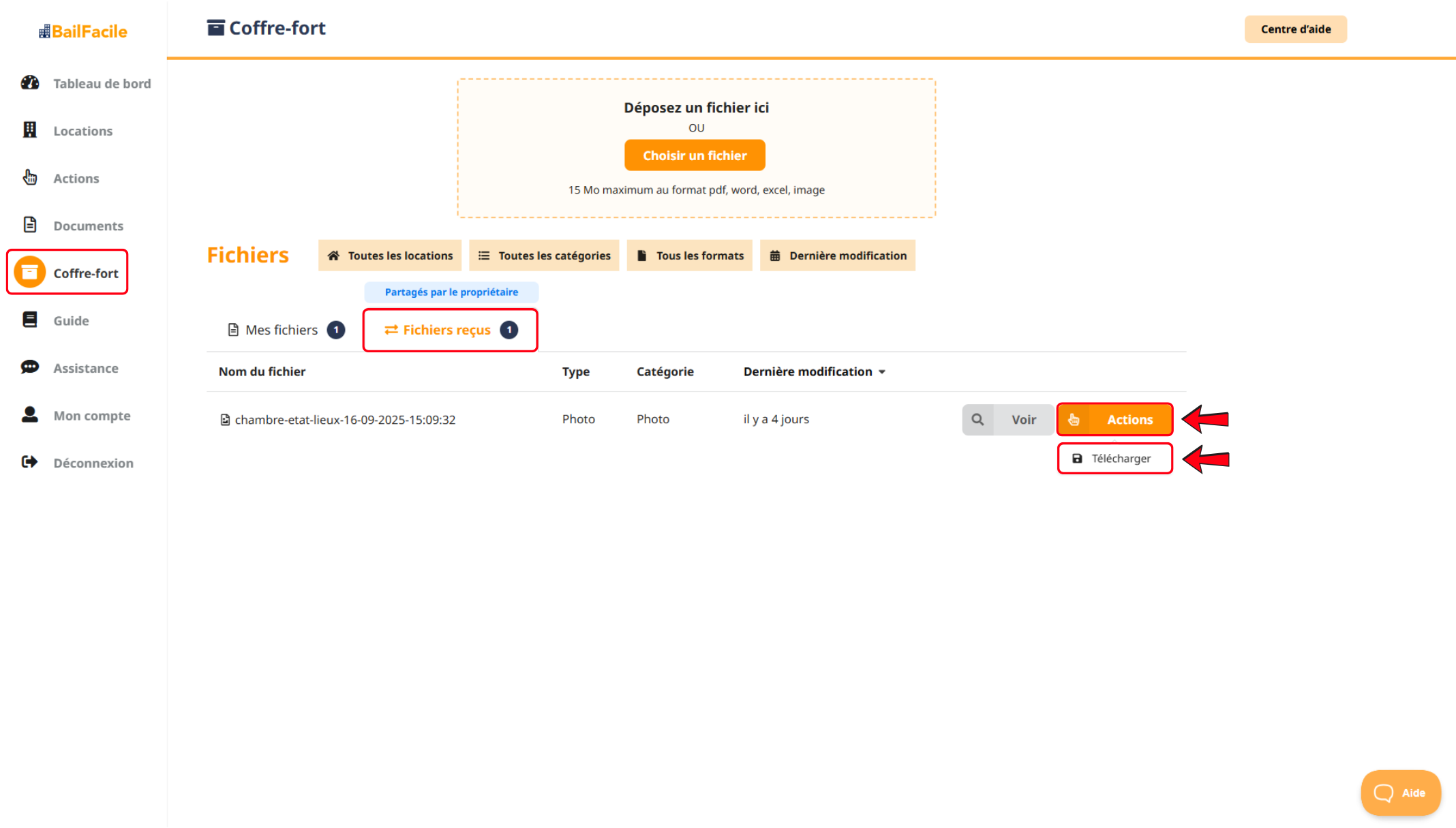 ➡️ Pour les documents partagés par votre propriétaire depuis son espace BailFacile, rendez-vous à l'onglet "Fichiers partagés" puis cliquez sur "Actions" et "Télécharger".