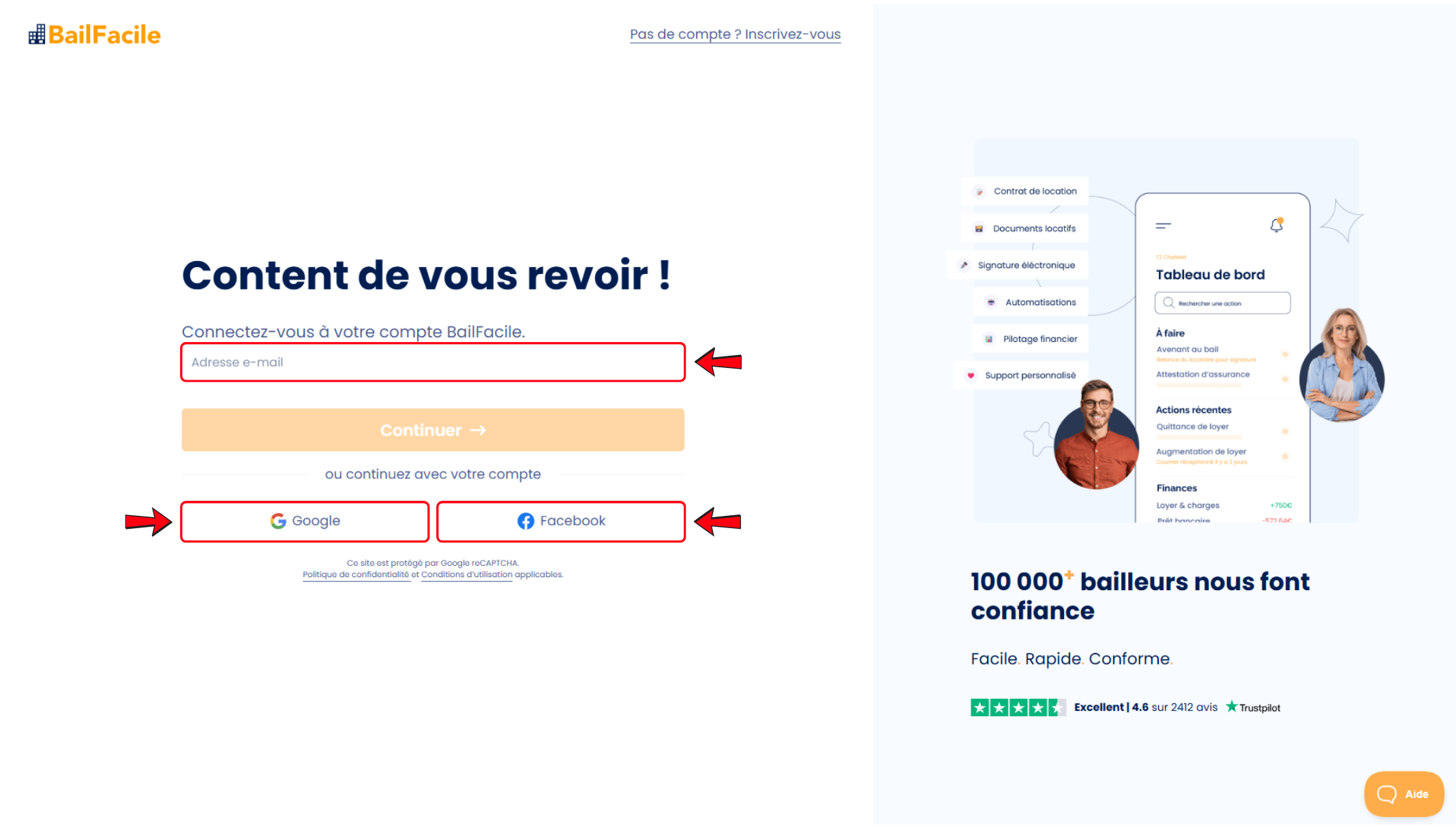 Si l’adresse e-mail indiquée correspond à celle de votre compte Google ou Facebook, vous pouvez vous connecter directement en cliquant sur les boutons correspondants. 😉