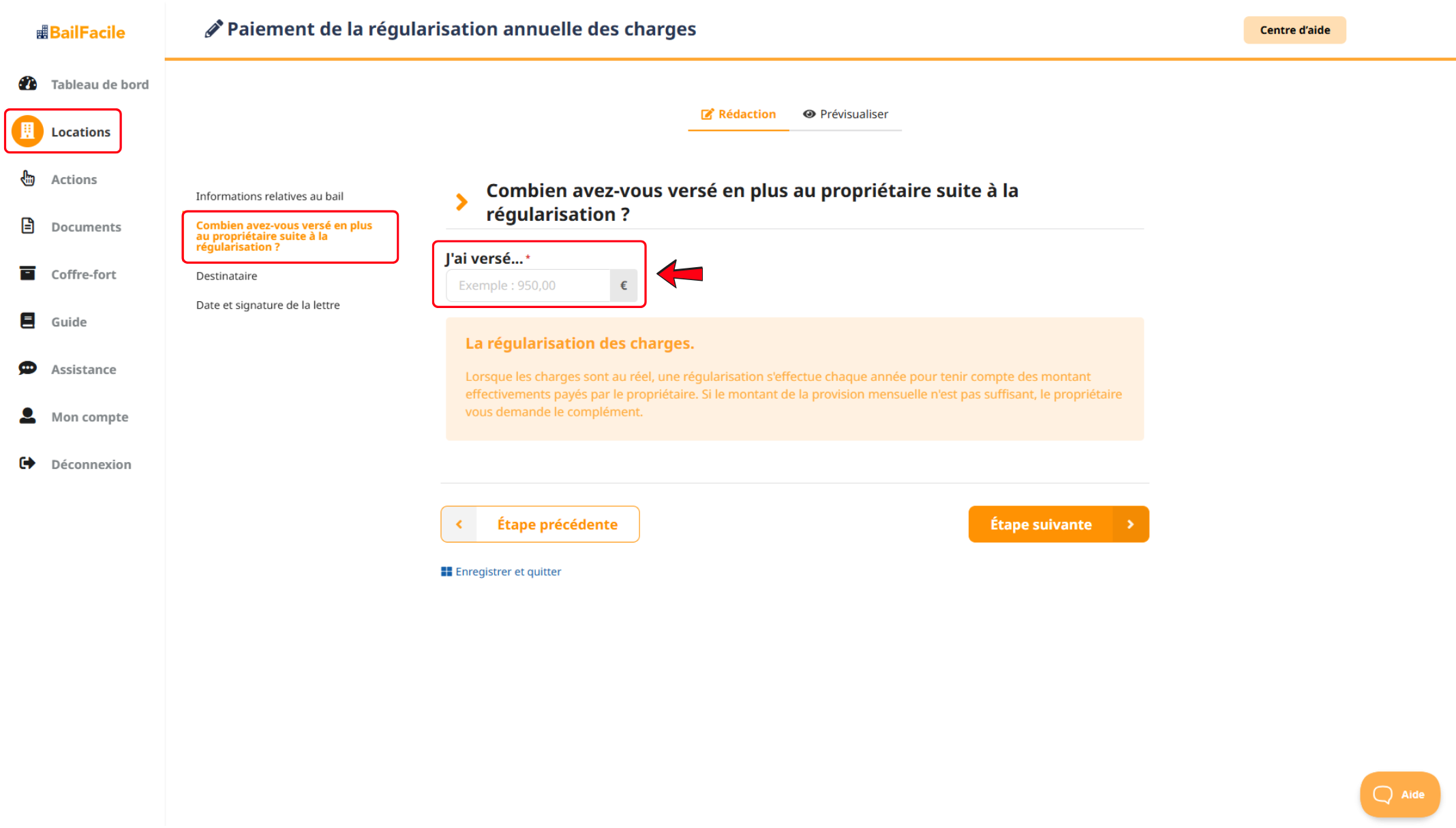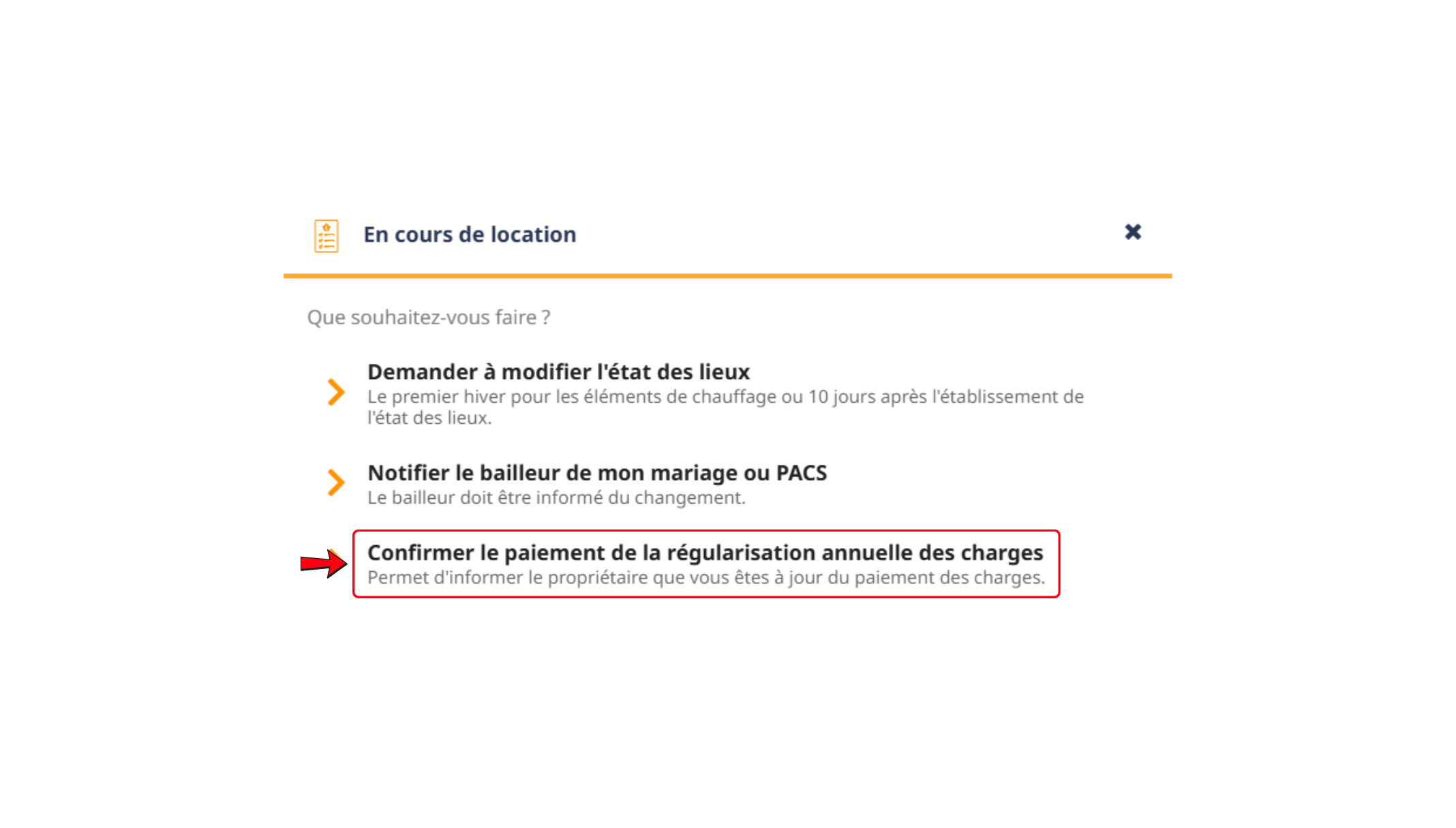 2 - Choisissez "Confirmer le paiement de la régularisation annuelle des charges"