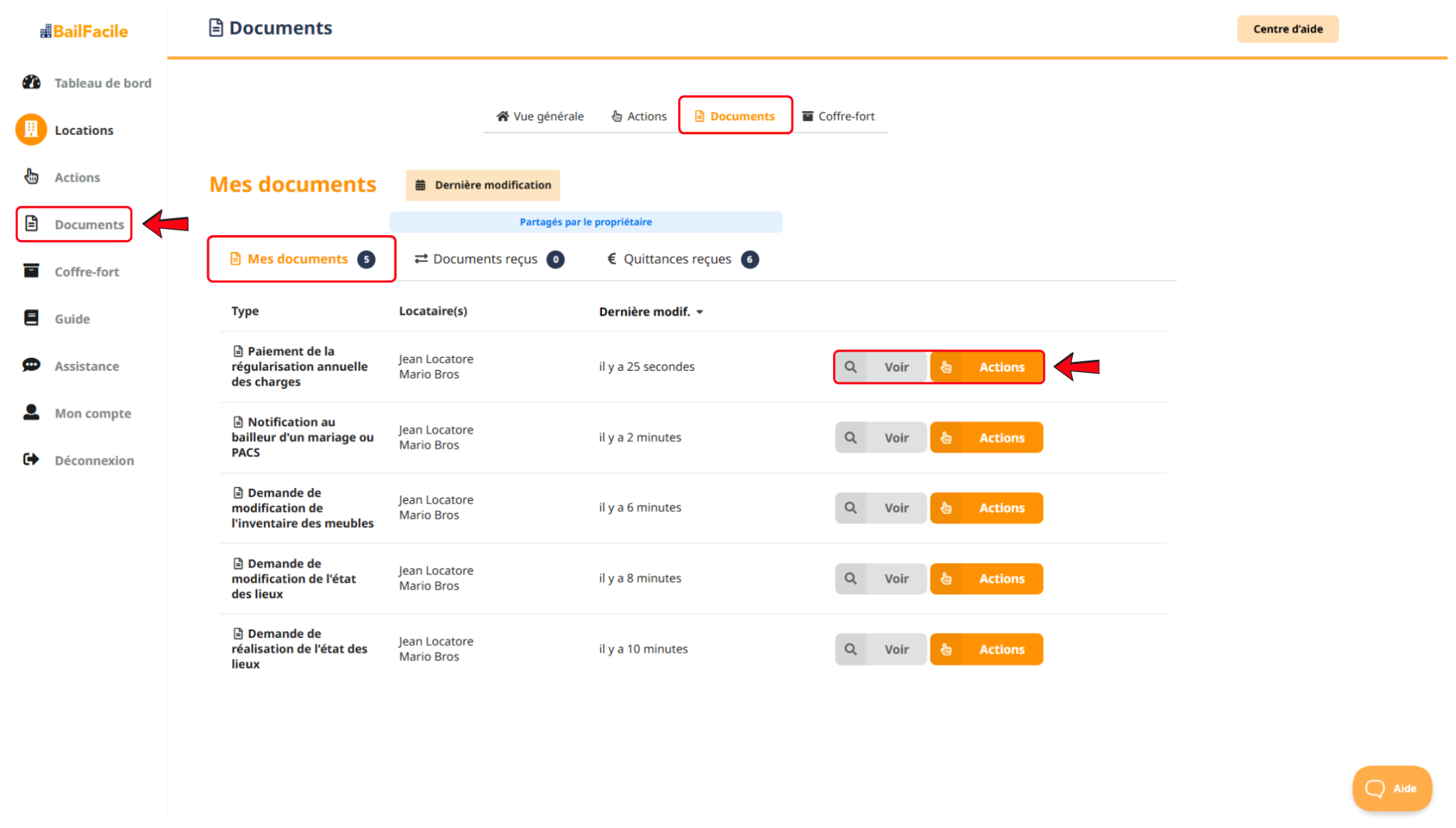 Cliquez sur "Actions" pour la télécharger/imprimer, modifier, partager, supprimer, ou sur "Voir" pour la visualiser.