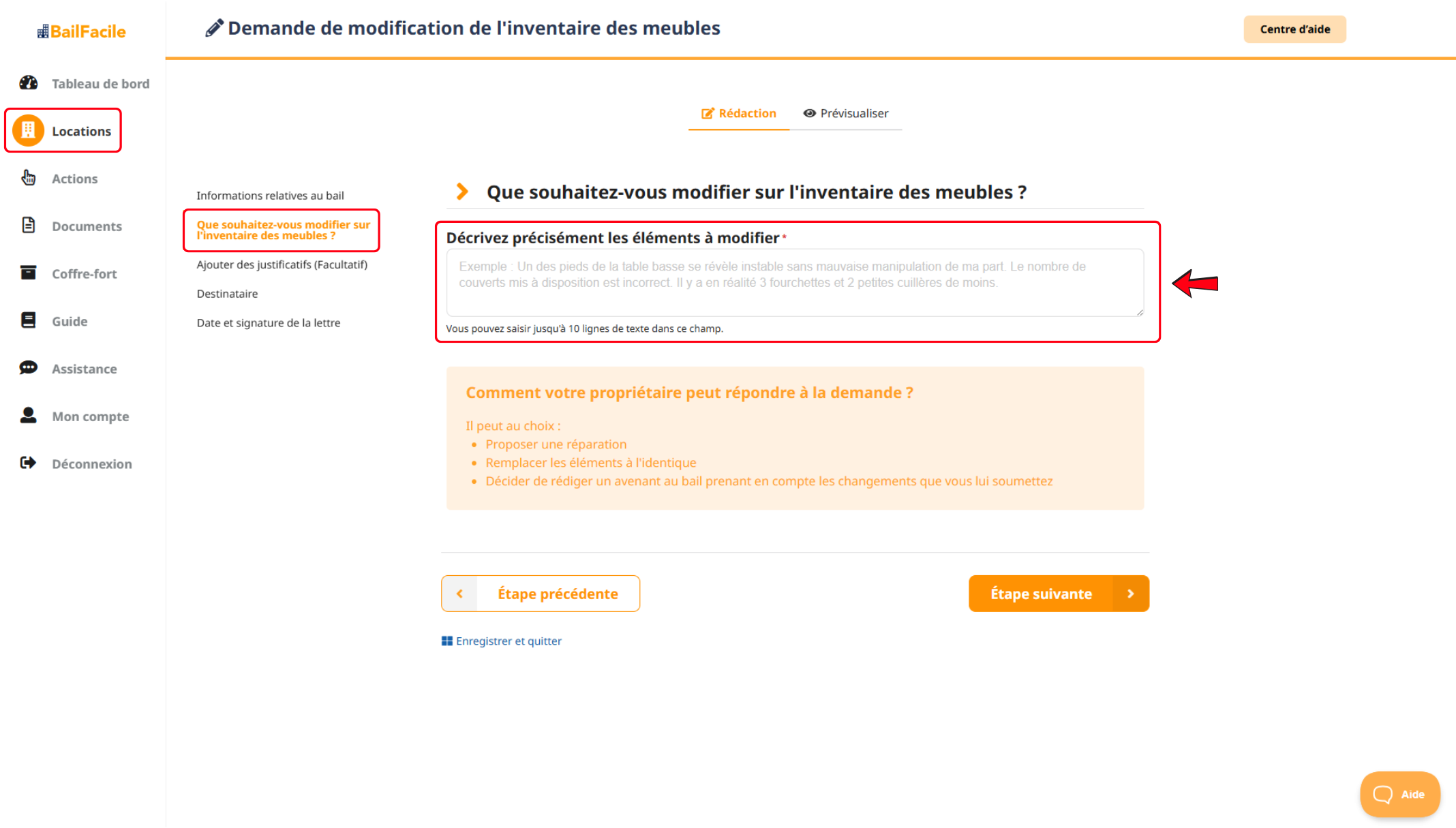 ➡️ Il faut utiliser le champ dédié pour décrire les éléments à modifier.